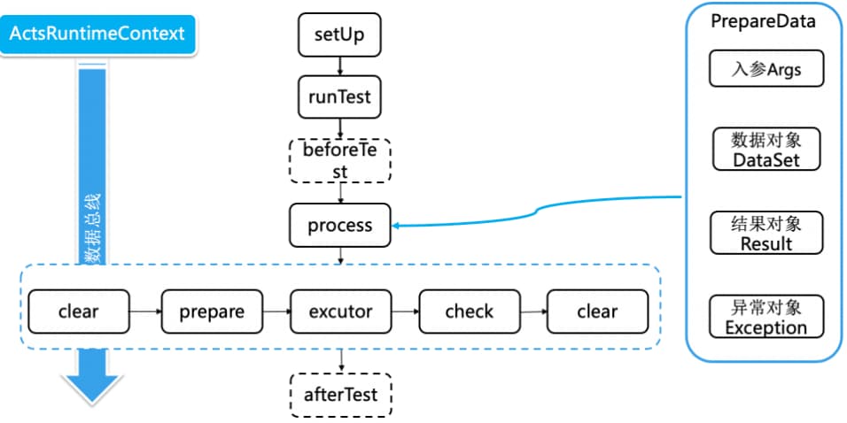 runTest 开始执行时会传入 PrepareData 和用例名称,ACTS 根据这些信息组装出 ActsRuntimeContext 上下文并在整个过程中传递,同时初始化 TestUnitHandler 测试处理器。runTest > process 方法执行期包含如下四个子流程: