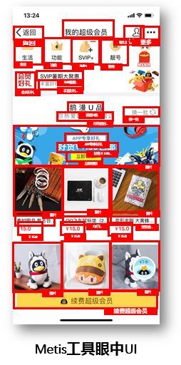 应用成熟的目标检测技术,可以看到Metis已经成功的把对象定位出来。而后通过分类器,把每一个元素分类和识别出来,例如哪些是可以点击的按钮,哪些是一个图片区域。然后通过OCR技术,把原件中对应的文本提取出来;如果是Logo,则通过图片的分类器把对应的Logo类型分类出来,而映射为特定的文本。可以看到,这一实现结果和人看到的是一样的,与人类的认知相仿。已经基本脱离了APP本身的代码实现,也不需要再关注应用后面的UI实现技术,可以解决文章前面所述的几个问题。