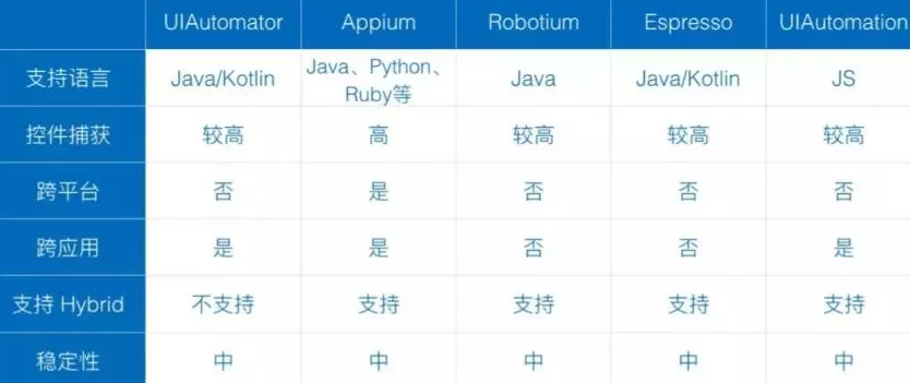 下图列举了一部分测试框架在一些指标上的表现,除了这些,还有Robot framework、阿里的macaca框架等也可考虑。