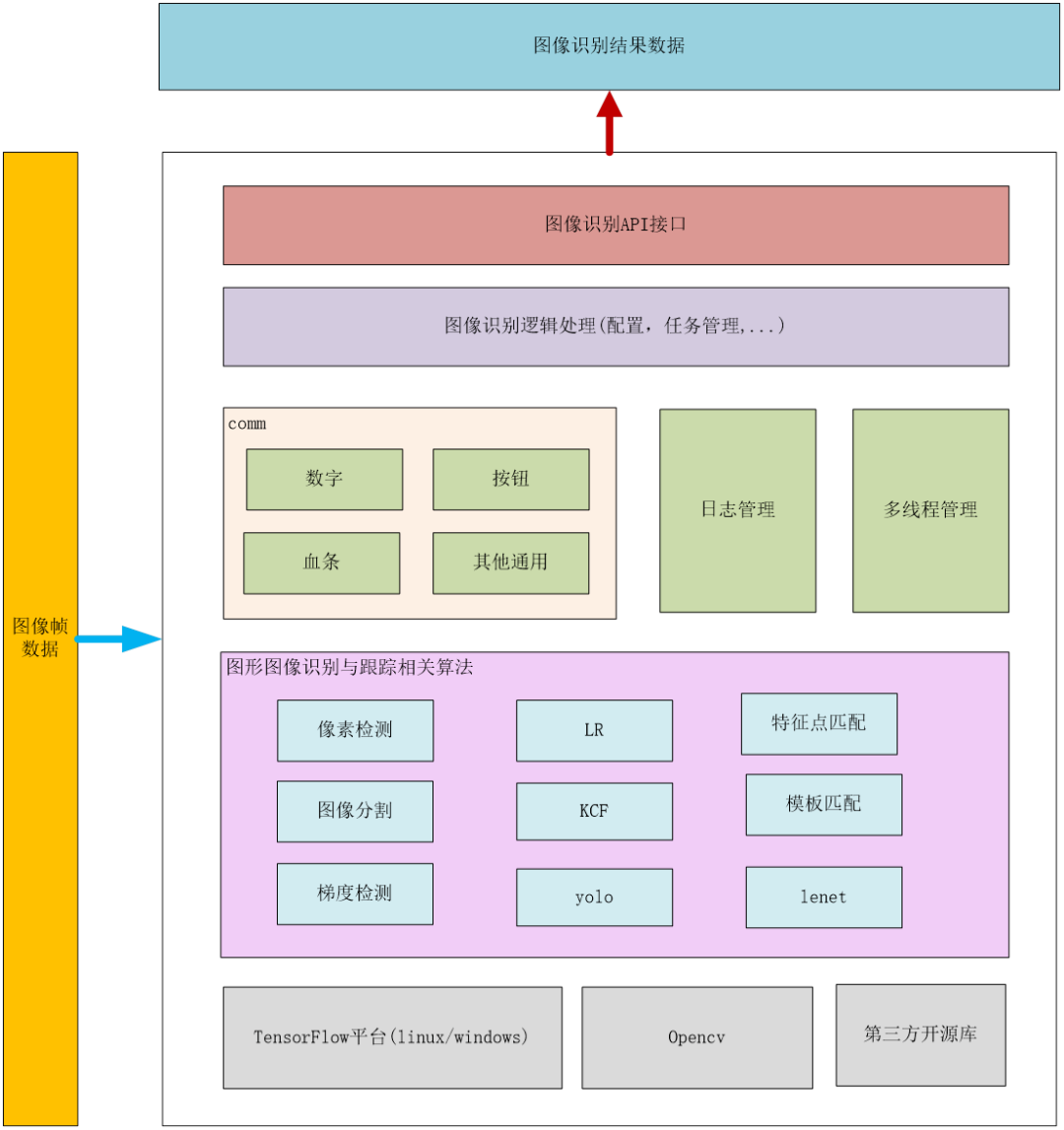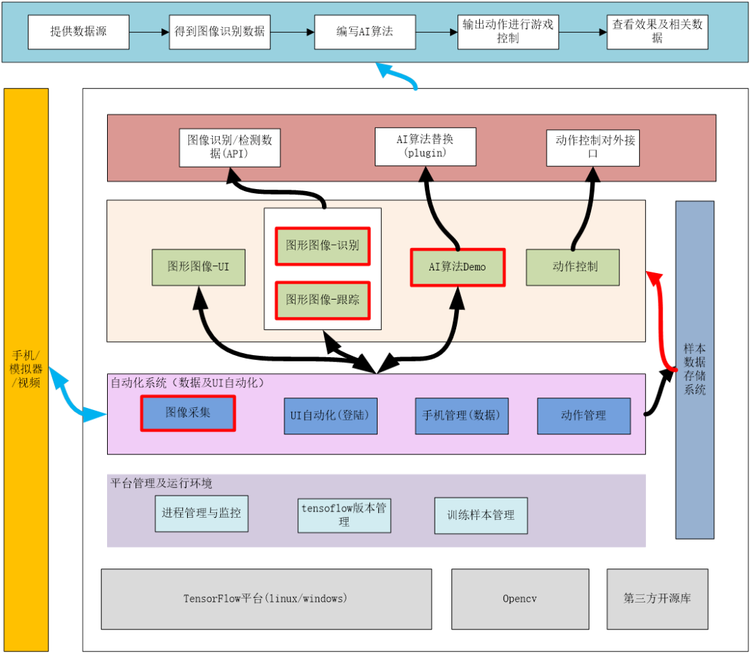 - 图形图像识别模块:包括的平台所有的图形图像识别算法,负责游戏内所有的图形图像识别,并将识别结果传到 AI 算法模块。
