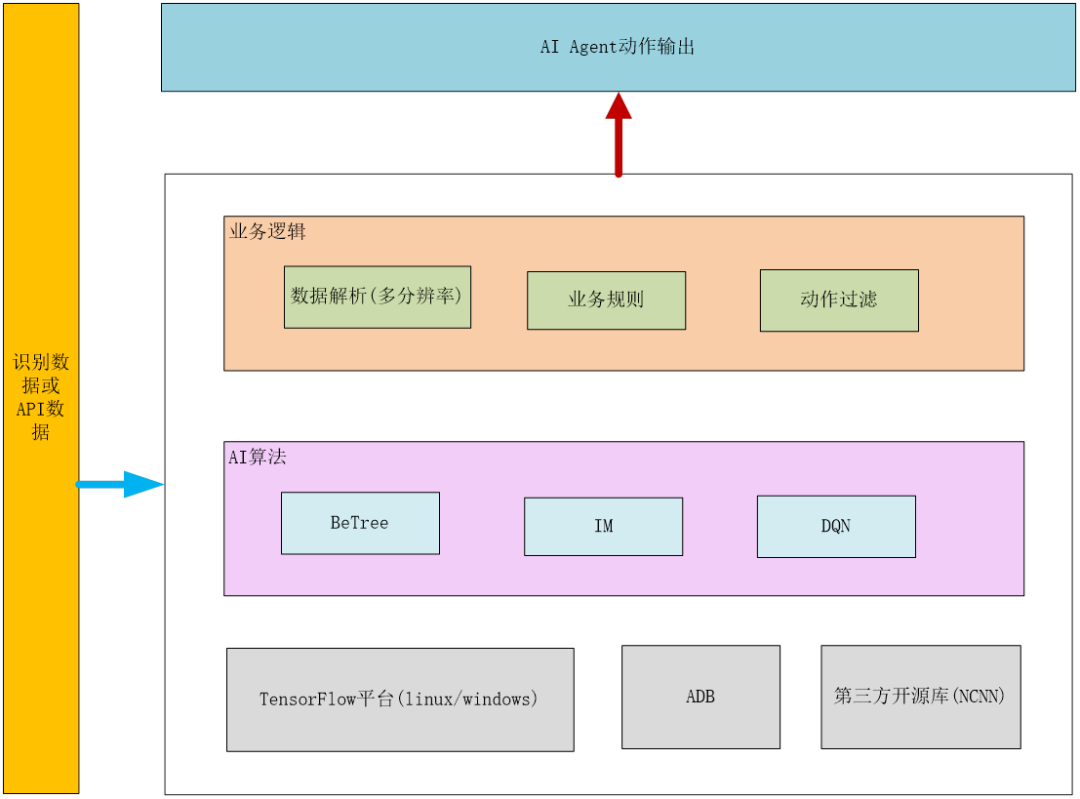 - 自动化系统:主要负责数据接入部分,如果是截图,则进行图像采集;如果是通过API传输数据,则进行通信连接。同时,会负责将AI的动作输出传到手机上执行。