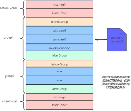 测试计划可包含多个 group,同一 group 中用例可共享执行上下文。在 group 中可定义 beforeGroup 和 afterGroup 用例,做为 group 内的前置用例和后置用例。beforeGroup 用例若执行失败,则直接跳过该 group 中剩余用例。不同 group 间用例互不影响,可并行执行。