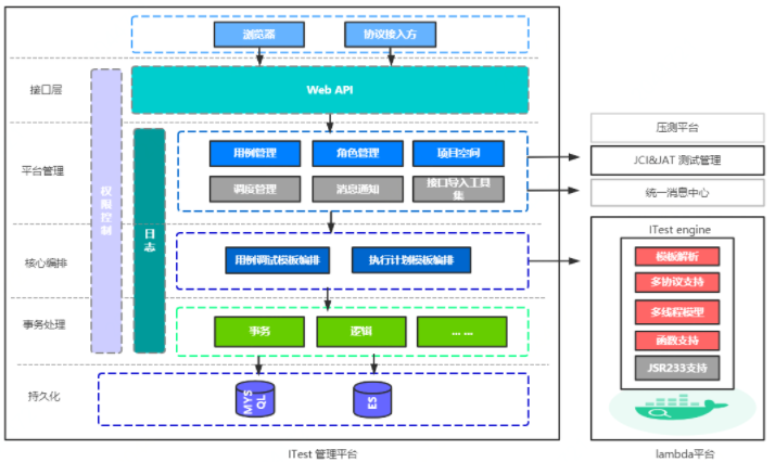 ITest 由管理平台和执行引擎两大模块构成。其中,管理平台是面向用户侧的,负责测试用例的编辑及快速调试,测试计划的编排及调度执行,测试结果展示,消息通知,角色权限管理,项目空间和个人空间用例及计划的维护等工作。执行引擎则负责测试模板的解析及执行工作。执行引擎通过 java 编写,可以通过 ITest Agent,Jenkins,容器云轻松集成,当前默认环境托管在数科容器云 lambda 上,提供面向数科测试环境及公网的集成测试能力。