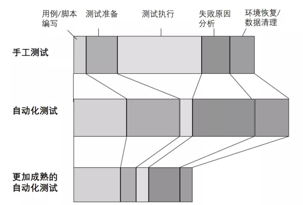进一步来看,EMTE只是计算了收益,并没有计算自动化测试的投入,那么通过计算ROI(投入产出比)来衡量收益更加合适些。从下图,我们可以看到自动化测试的时间投入,也会包含脚本编写、测试准备、测试执行、失败原因分析和环境恢复/数据清理等事项。
