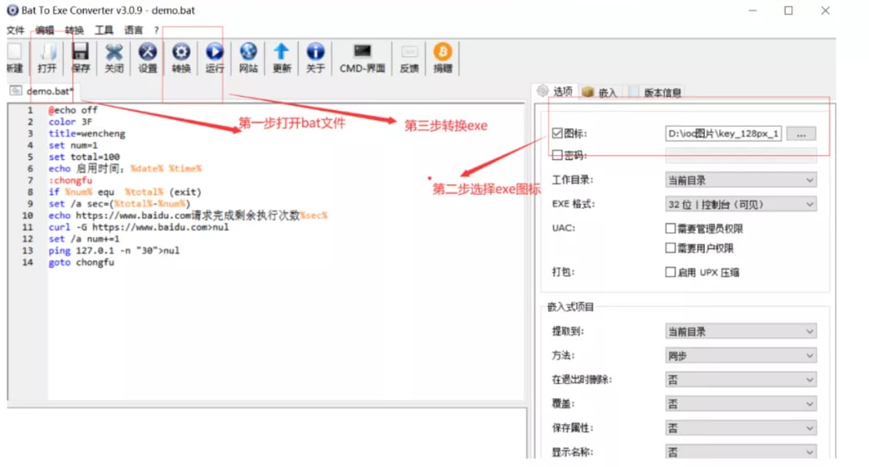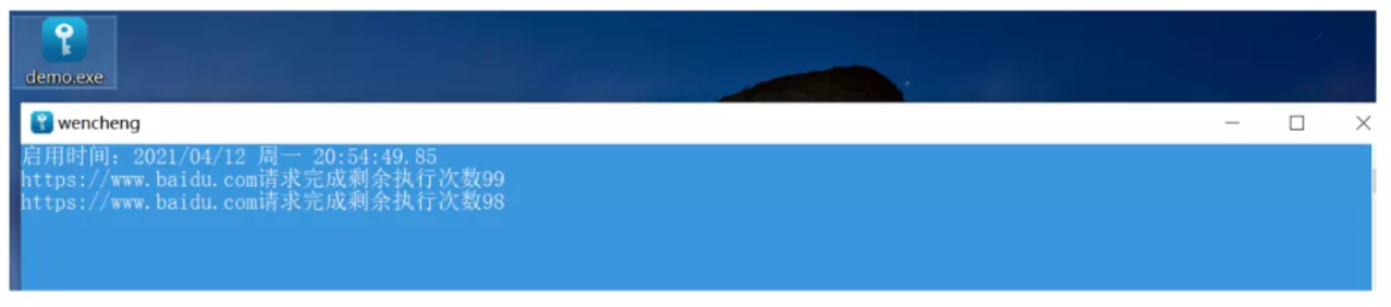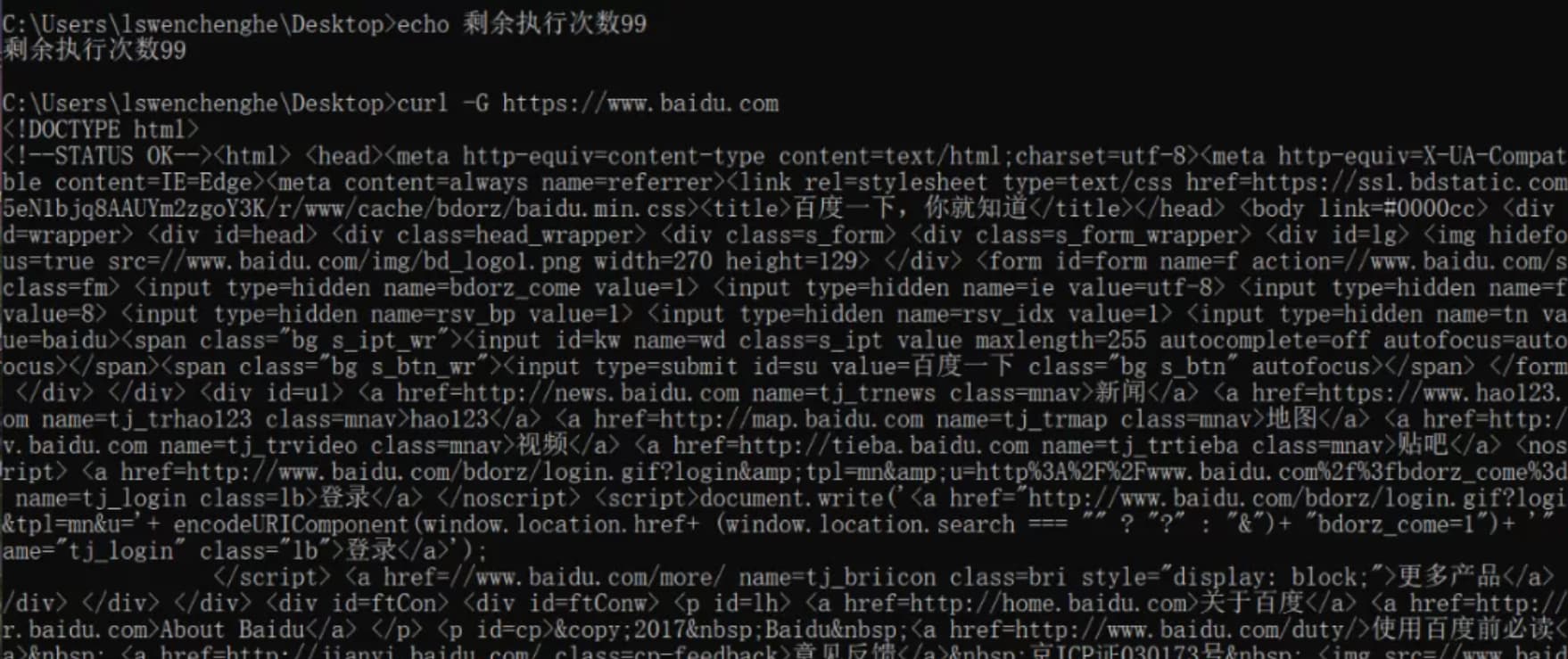@echo off color 3F chcp 65001 title=wencheng set num=1 set total=100 echo 启用时间:%date% %time% :chongfu if %num% equ %total% (exit) set /a sec=(%total%-%num%) echo https://www.baidu.com请求完成剩余执行次数%sec% curl -G https://www.baidu.com>nul set /a num+=1 ping 127.0.1 -n "30">nul goto chongfu执行完成