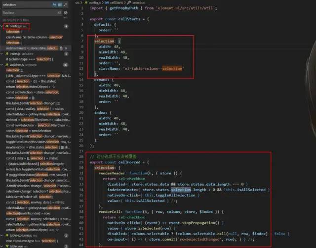 既然知道,table组件是通过selection存放被选中的row,那么,就搜索selection吧。