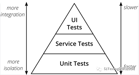 最明显的是,按照自动化测试金字塔理论,大量的基础工作是在单元测试阶段进行的,而接口测试是基于单元测试完成,然后最终通过UI测试进行界面化的验证,这个三角形是自动化测试的策略结构。