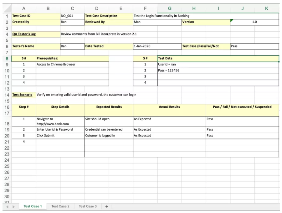 本方法是中小型项目中比较常见的测试用例管理方法。其优势是简单易用,而劣势是需要自己对测试用例模版进行定制,并且当测试用例过多的时候管理成本会急剧增加。其次对于本地文件模式,则很难让多人进行协作编写(Google Sheets这种在线文档没有这个问题)。下面是一个Excel实例。