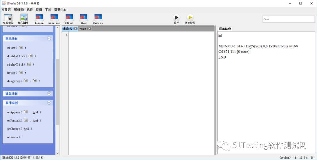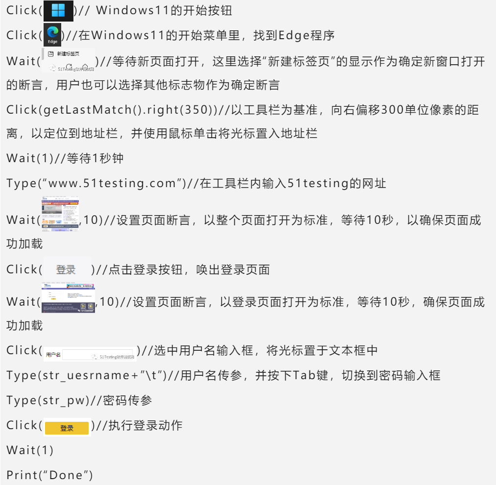 在了解了语法之后,可以试着在Sikuli X的界面中写出自己的实用例子。本文以在Windows11系统使用Edge浏览器打开51testing网站为例,进行实例说明。脚本如下,每步给出了注释: