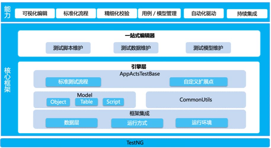 ACTS(AntCoreTest)源于蚂蚁金服多年金融级分布式架构工程的测试实践的积累和沉淀,是一款白盒测试框架,旨在为企业提供高效、精细化的接口自动化测试。 与现有的诸如 TestNG 等开源框架相比,ACTS 除了具备通用的数据自动化驱动等测试能力外,还具有契合快速的互联网发展和复杂的分布式金融系统特点的模型驱动、可视化编辑和标准流程引擎等新特性,可辅助工程师高效、高质量地完成接口测试用例编写以及标准化精准化测试验证。ACTS 是基于数据模型驱动测试引擎执行的的新一代测试框架(如下图所示),适配 TestNg+Spring 的测试上下文环境,以 YAML 为数据载体并在此上构建数据模型驱动,实现了一站式编辑、精细化校验和高效用例管理等,可以有效提高测试效率。