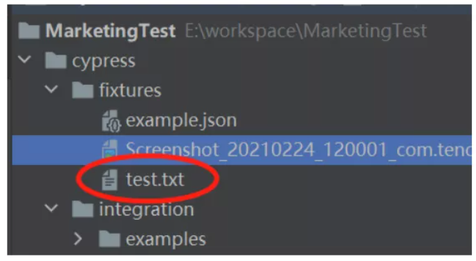 通常的做法是将Cypress测试所需的所有文件放在Cypress/fixtures文件夹中。例如:新建test.txt文件
