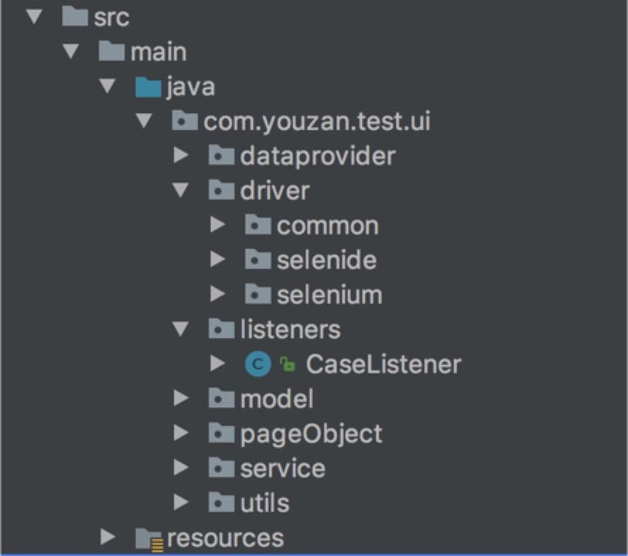 对 web 页面所有元素的操作都是在这里定义接口并实现的。driver 对 selenide&selenium 提供的接口做了二次封装,对外提供封装后的接口。common 实现了一些和接口相关的公共方法,比如模拟键盘按钮等,目前 common 封装的方法不多,大多功能都可以通过 selenide&selenium 实现。driver 层对开源工具接口做了二次封装,想要驱动一个浏览器还有一个必不可少的工具 —— 浏览器驱动,这个驱动放在 resources 里,驱动的版本必须与被测浏览器版本相匹配。1.3 listeners — 监听器