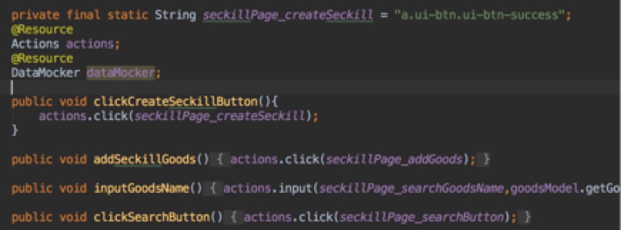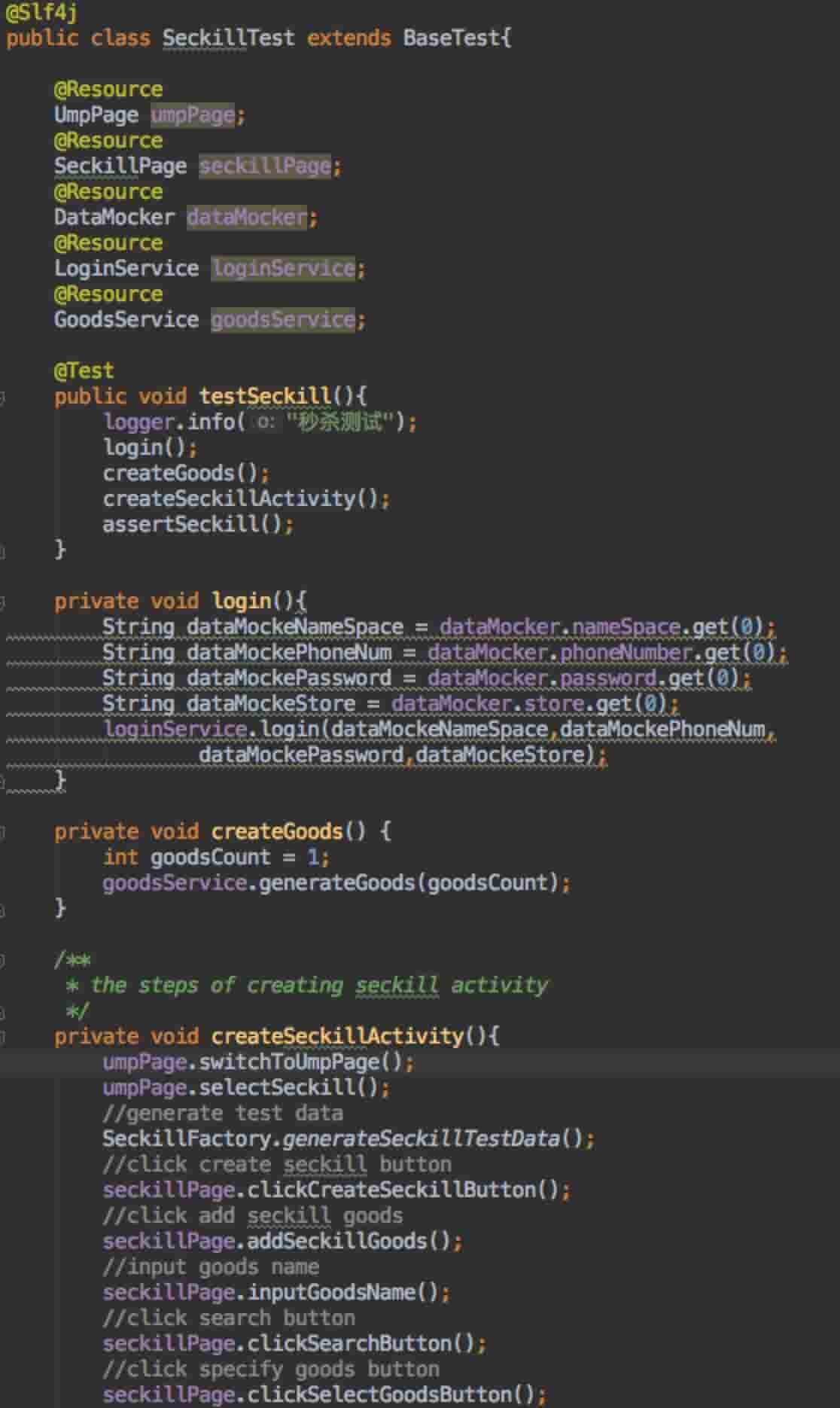 - 接着是创建秒杀活动,创建秒杀活动的所有业务步骤都封装到 seckillPage,这就是个 pageObject 的实现,也是用例设计中最主要的环节;