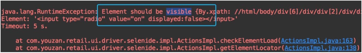 直接调用 selenide 或者 selenium 的接口经常会遇到些令人头疼的问题,比如网络问题使页面 loading 太慢,需要操作的元素还没展示出来,这种情况就会经常报元素找不到的 error,用例执行失败,但实际上这种报错不是一个 bug,测试结果是无效的。为了提高误报率 driver 层接口实现了等待元素加载的功能,使用的关键接口:Selenide.$(elementLocator).waitUntil(Condition.appears, timeout)。参考代码:`/**