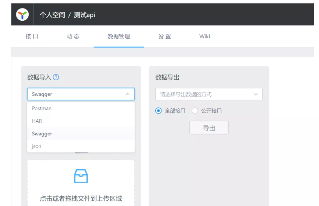 为了方便开发者将接口数据分析给第三方或其他使用者,YApi 内置了方便易用的接口数据导出功能。